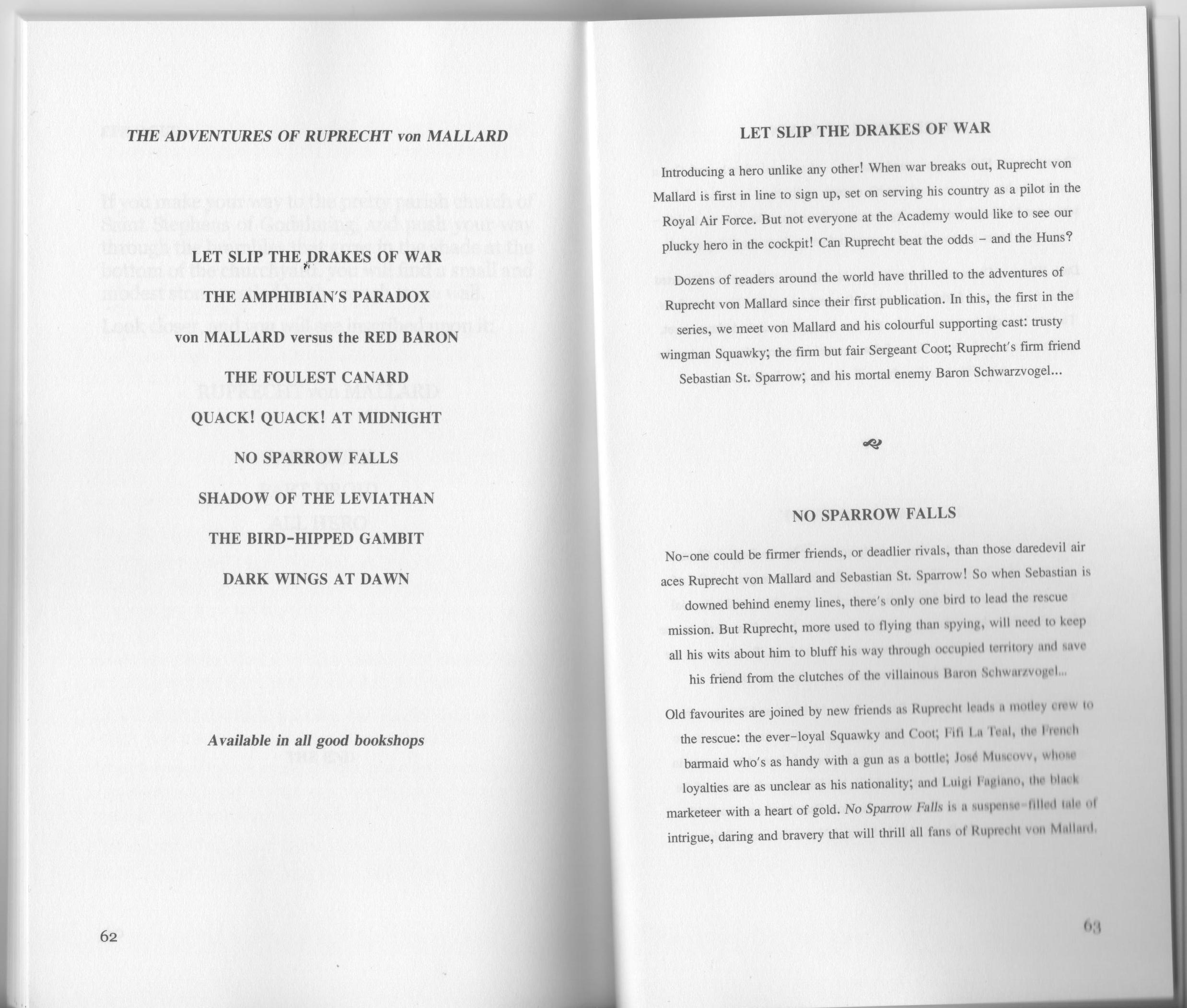 This slim volume on my desk looks to be a partial reconstruction of the original, a para-facsimile. Though the cover seems to be a near-perfect reconstruction of the original artwork, (with some slight compression in the vertical plane) the interior is sparse. Beyond a single-page editorial note from the mysterious SPC, and a list of von Mallard’s earlier adventures at the rear (along with reproductions of three original blurbs – Let Slip the Drakes of War, No Sparrow Falls, and Dark Wings at Dawn – there is no hint as to the original publisher, author, or year of publication.