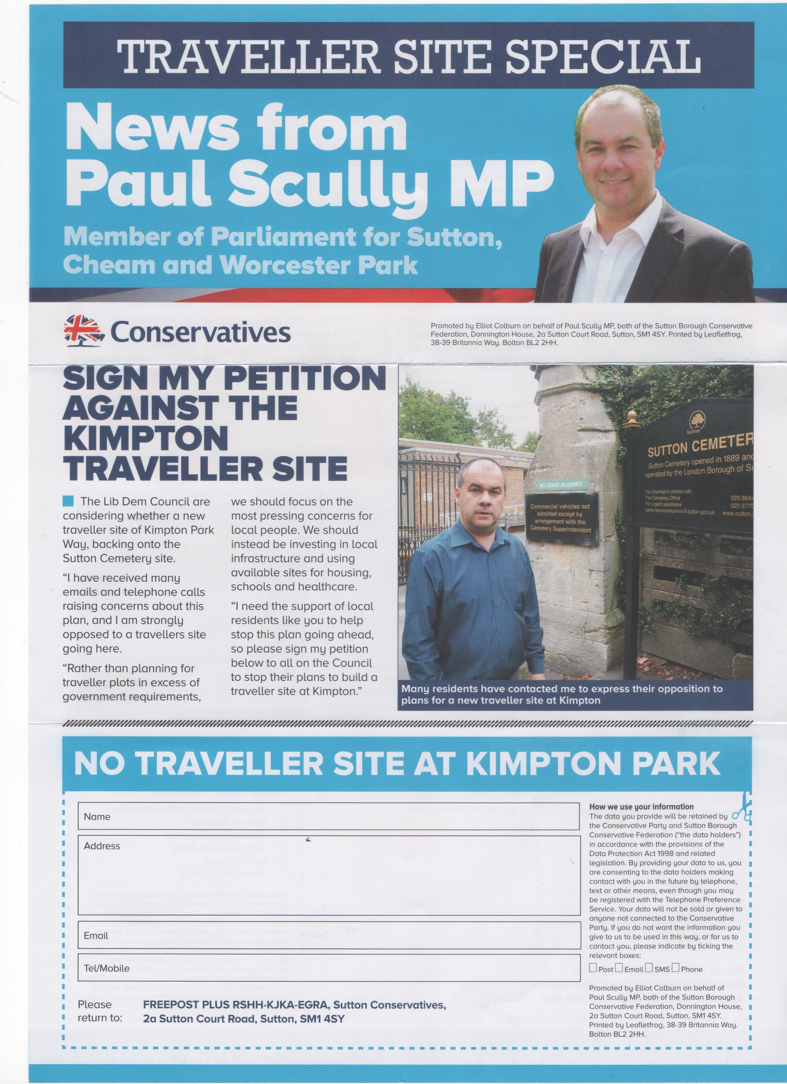 “Thank you for your email about Paul’s petition against a Traveller site at Kimpton Park. Paul has asked me to get back to you on this.